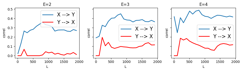 Once we added noise, CCM incorrectly infers that \(X \rightarrow Y\). So now we see that when the dynamical system is not perfectly determinsitic, CCM fails. (Even when the Gaussian noise has a small standard deviation = 0.015). This may be a problem since we expect real world dynamical systems to have some randomness.